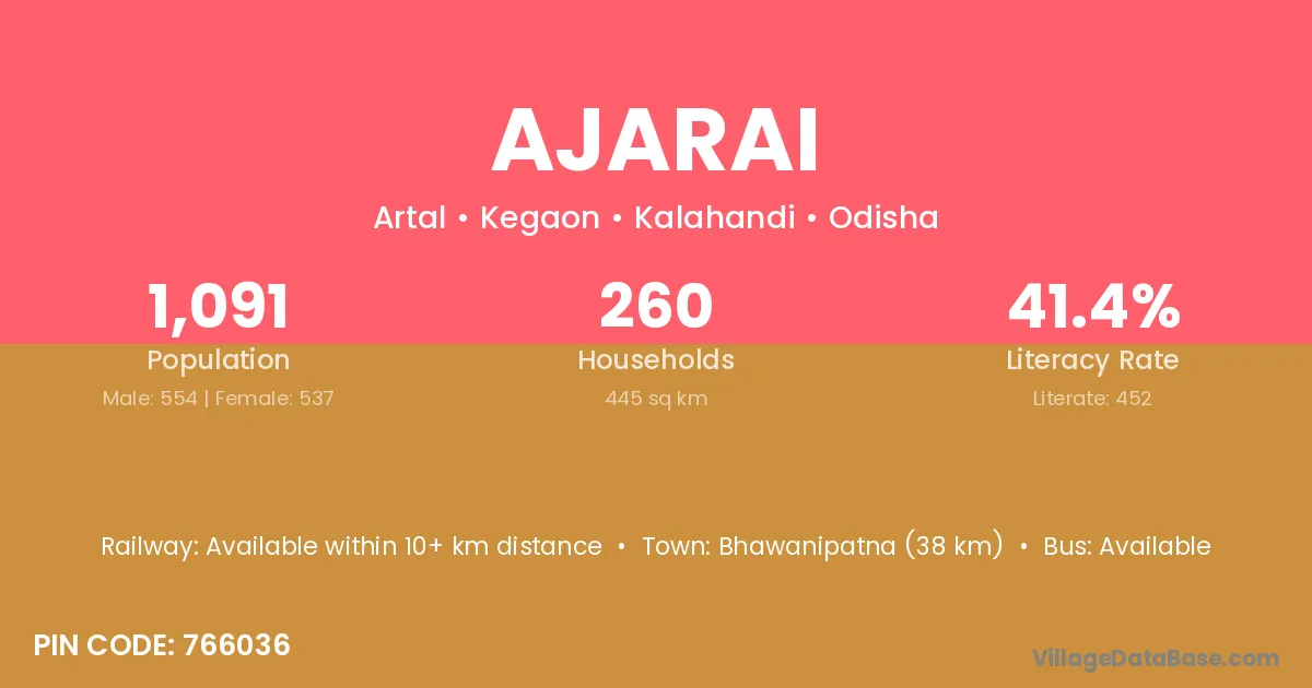 Bhawanipatna (38 km) is the nearest town to Ajarai village for major economic activities and is located approximately 38 km away.