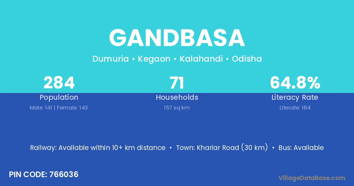 Khariar Road (30 km) is the nearest town to Gandbasa village for major economic activities and is located approximately 30 km away.