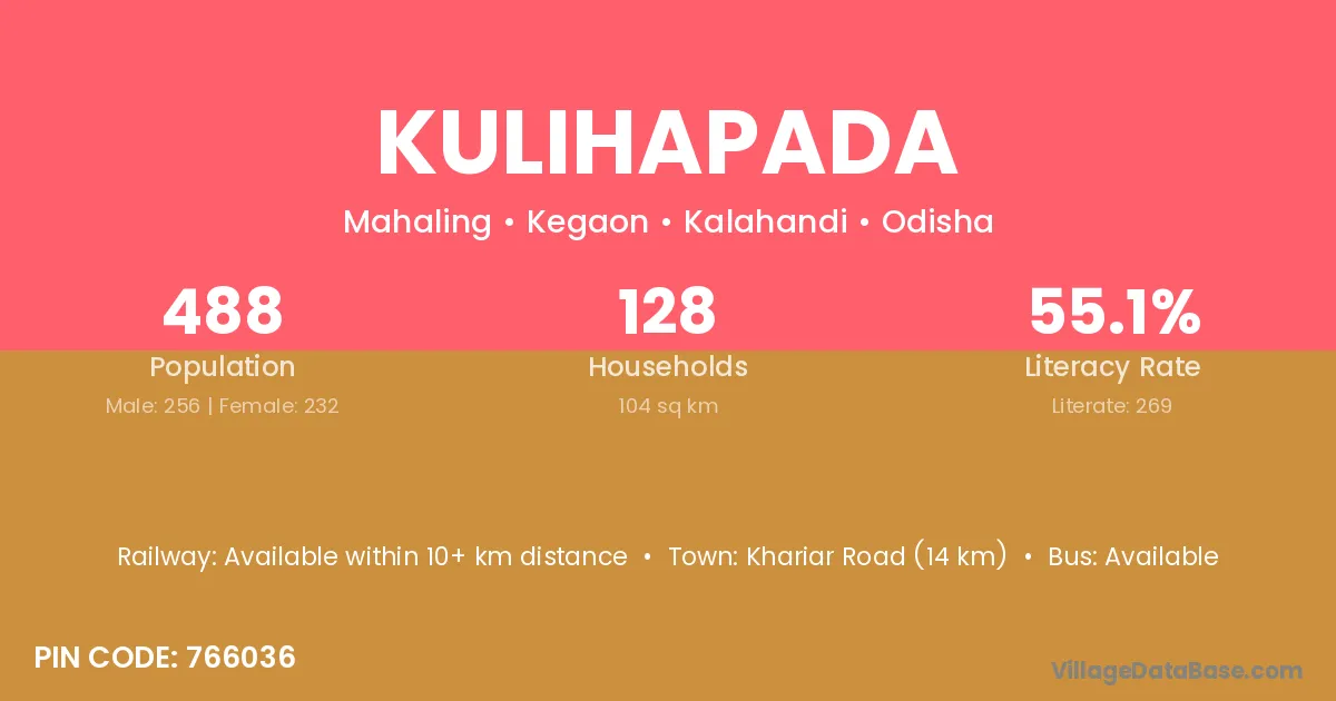 Khariar Road (14 km) is the nearest town to Kulihapada village for major economic activities and is located approximately 14 km away.
