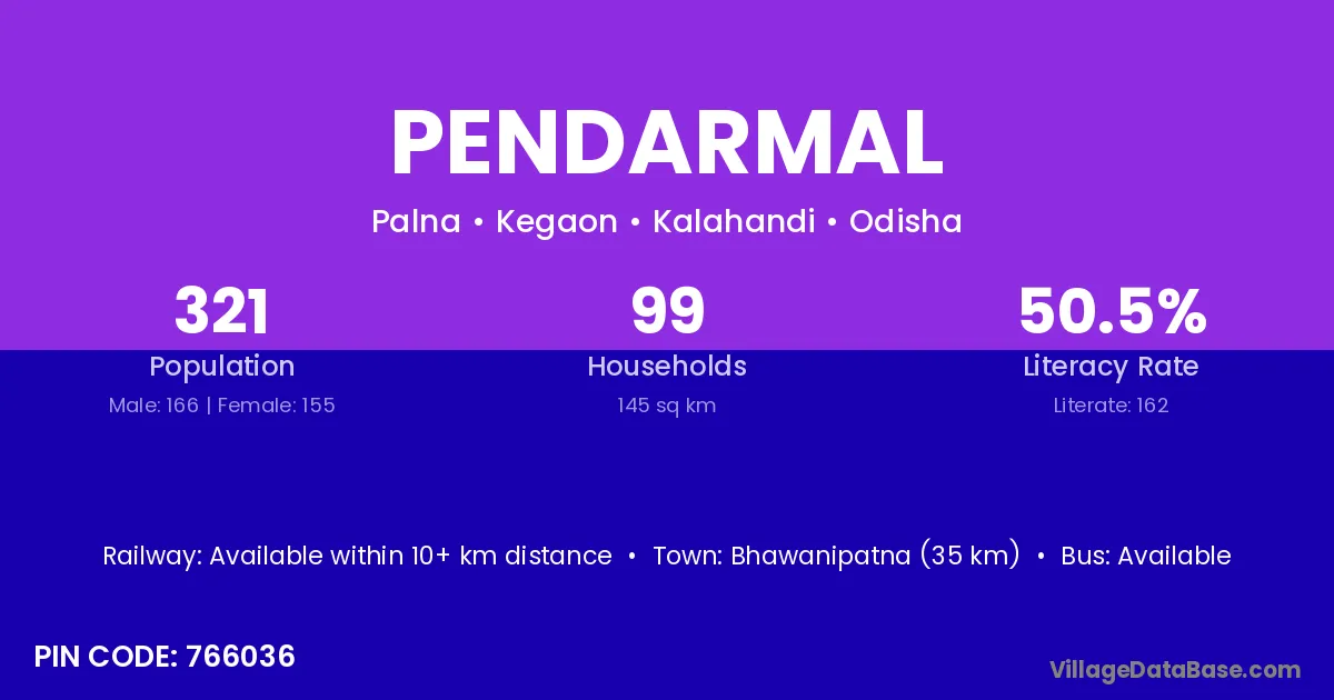 Bhawanipatna (35 km) is the nearest town to Pendarmal village for major economic activities and is located approximately 35 km away.