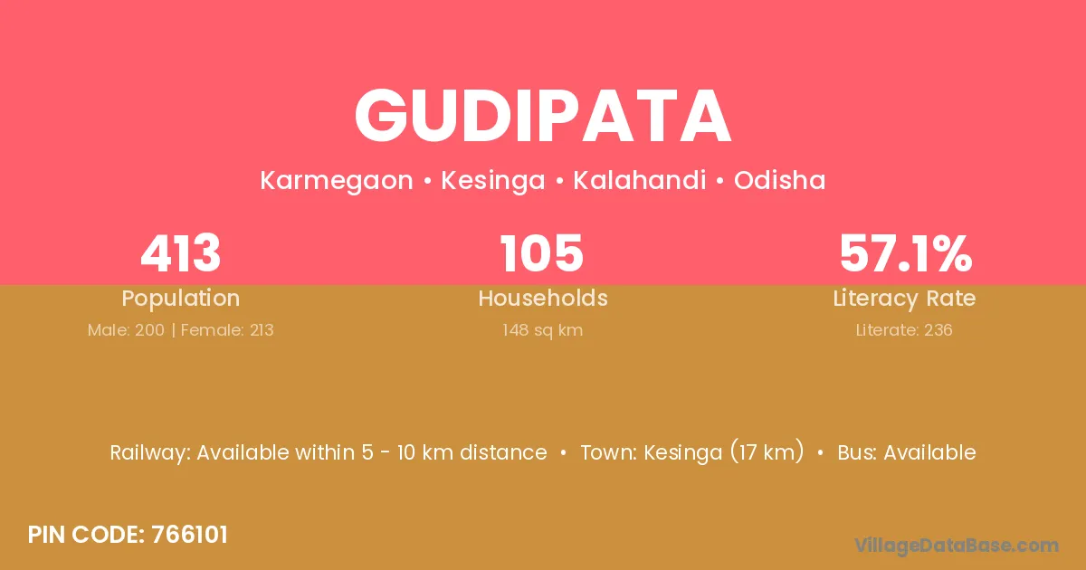 Kesinga (17 km) is the nearest town to Gudipata village for major economic activities and is located approximately 17 km away.