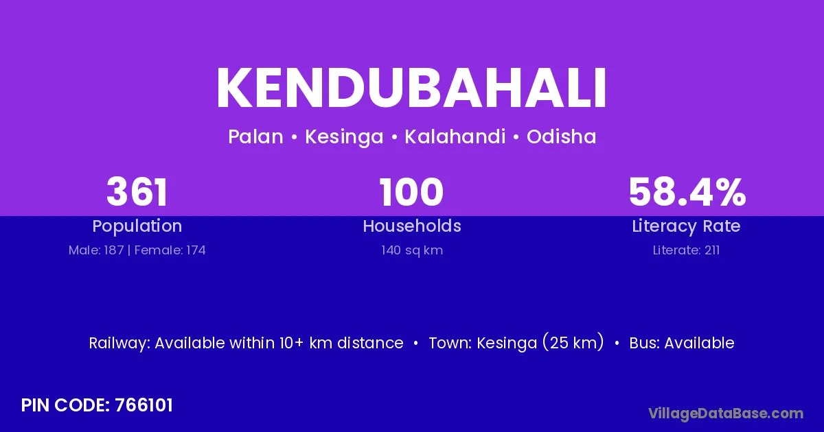 Kesinga (25 km) is the nearest town to Kendubahali village for major economic activities and is located approximately 25 km away.