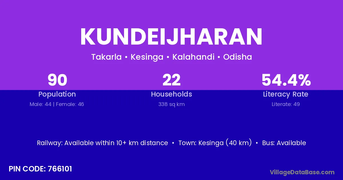 Kundeijharan village has a total population of 90 people, of which 44 are males and 46 are females.