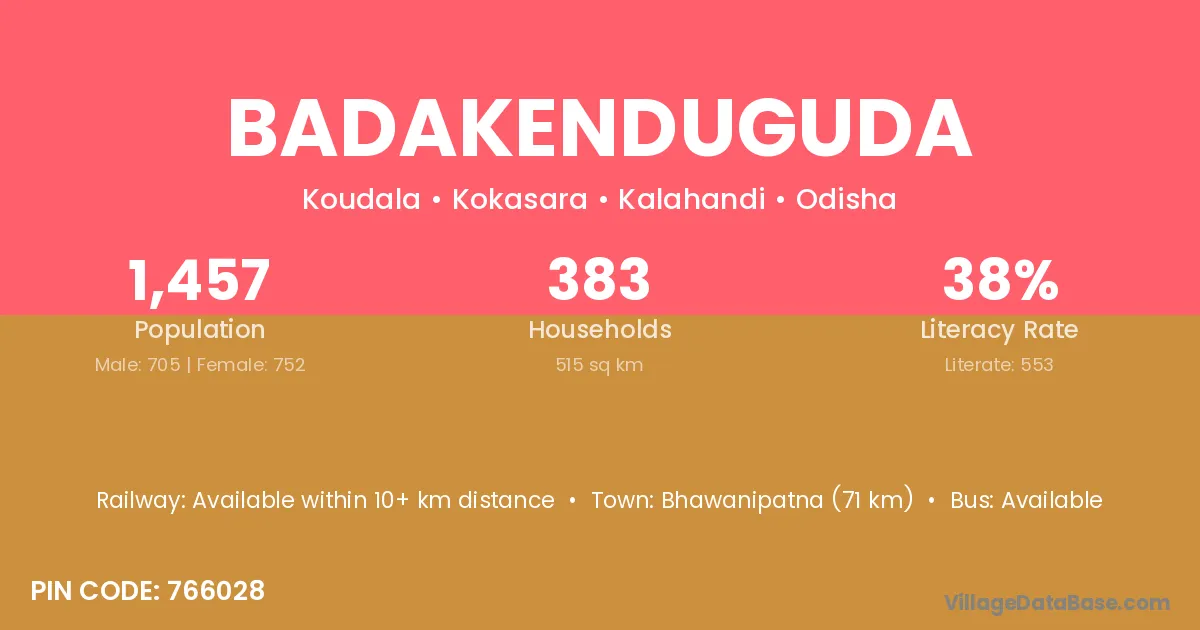 Bhawanipatna (71 km) is the nearest town to Badakenduguda village for major economic activities and is located approximately 71 km away.