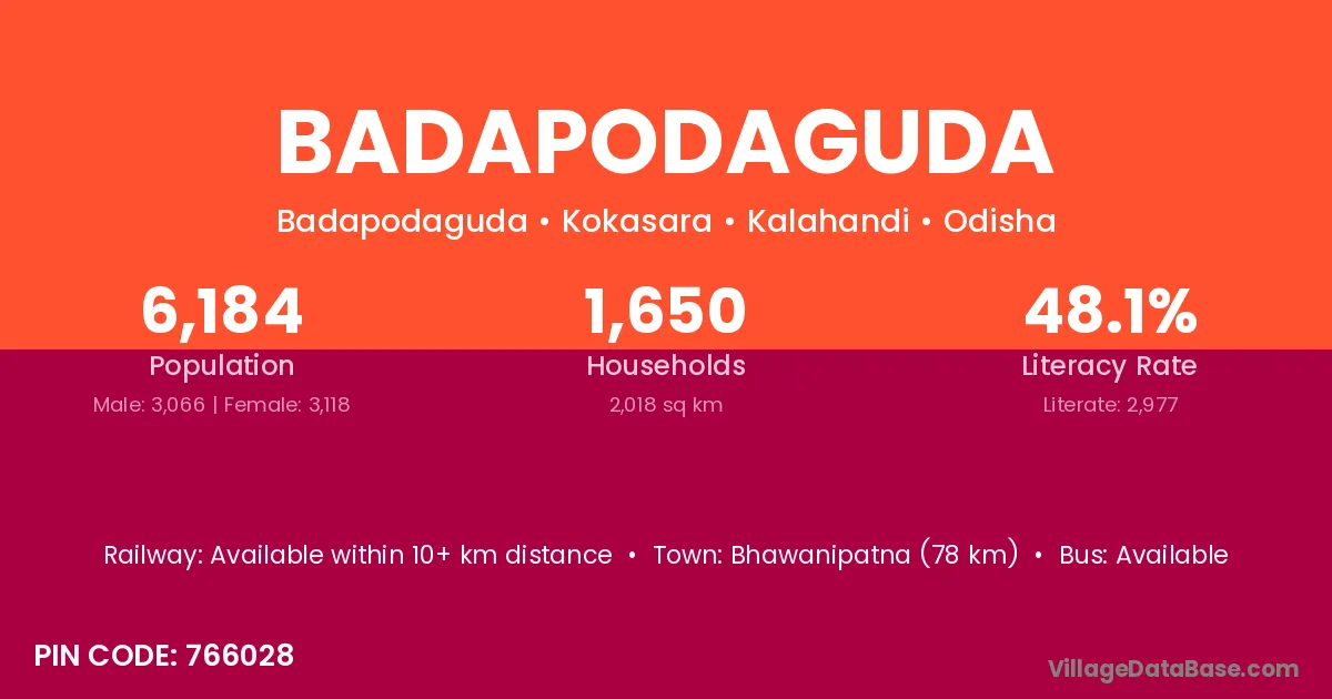 Badapodaguda village has a total population of 6,184 people, of which 3,066 are males and 3,118 are females.