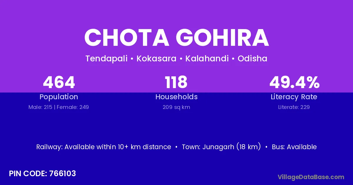 Junagarh (18 km) is the nearest town to Chota Gohira village for major economic activities and is located approximately 18 km away.