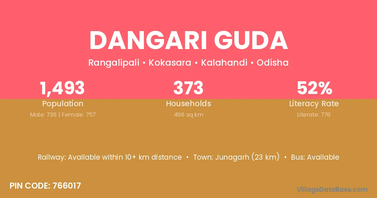 Junagarh (23 km) is the nearest town to Dangari Guda village for major economic activities and is located approximately 23 km away.