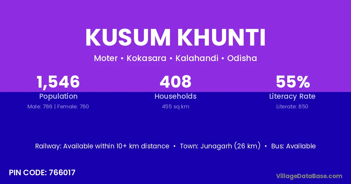 Junagarh (26 km) is the nearest town to Kusum Khunti village for major economic activities and is located approximately 26 km away.
