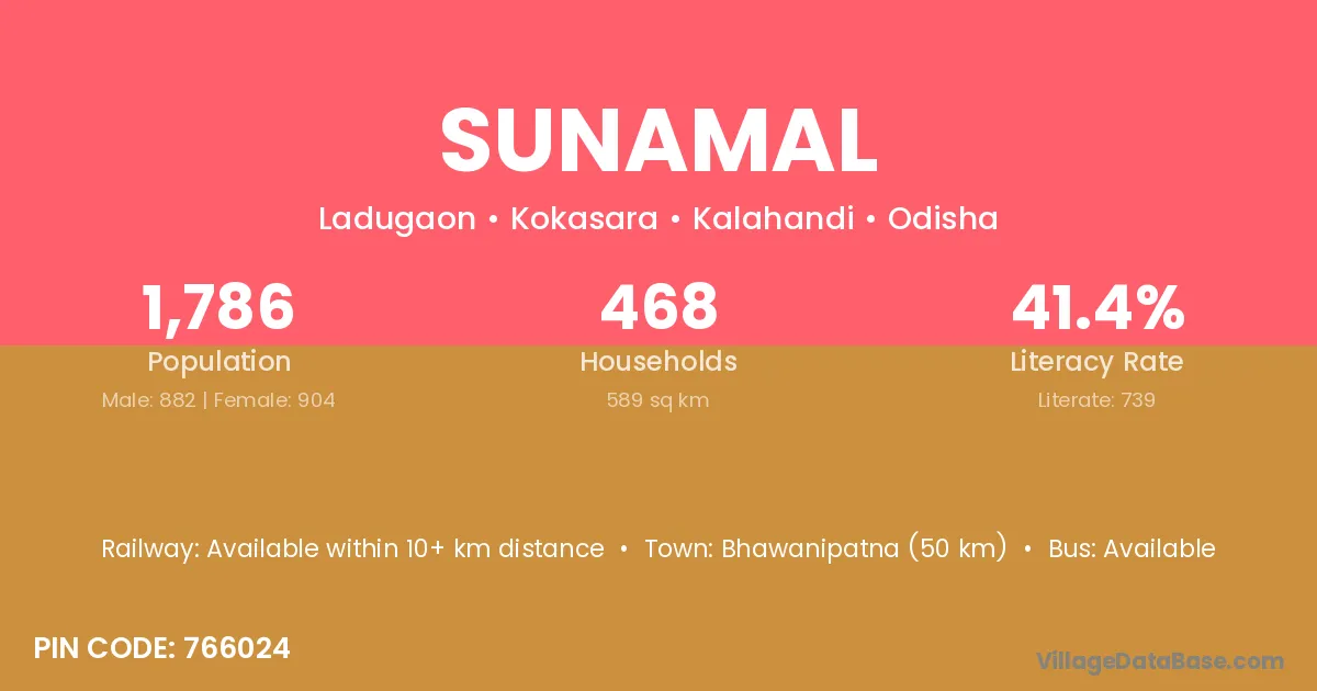 Bhawanipatna (50 km) is the nearest town to Sunamal village for major economic activities and is located approximately 50 km away.