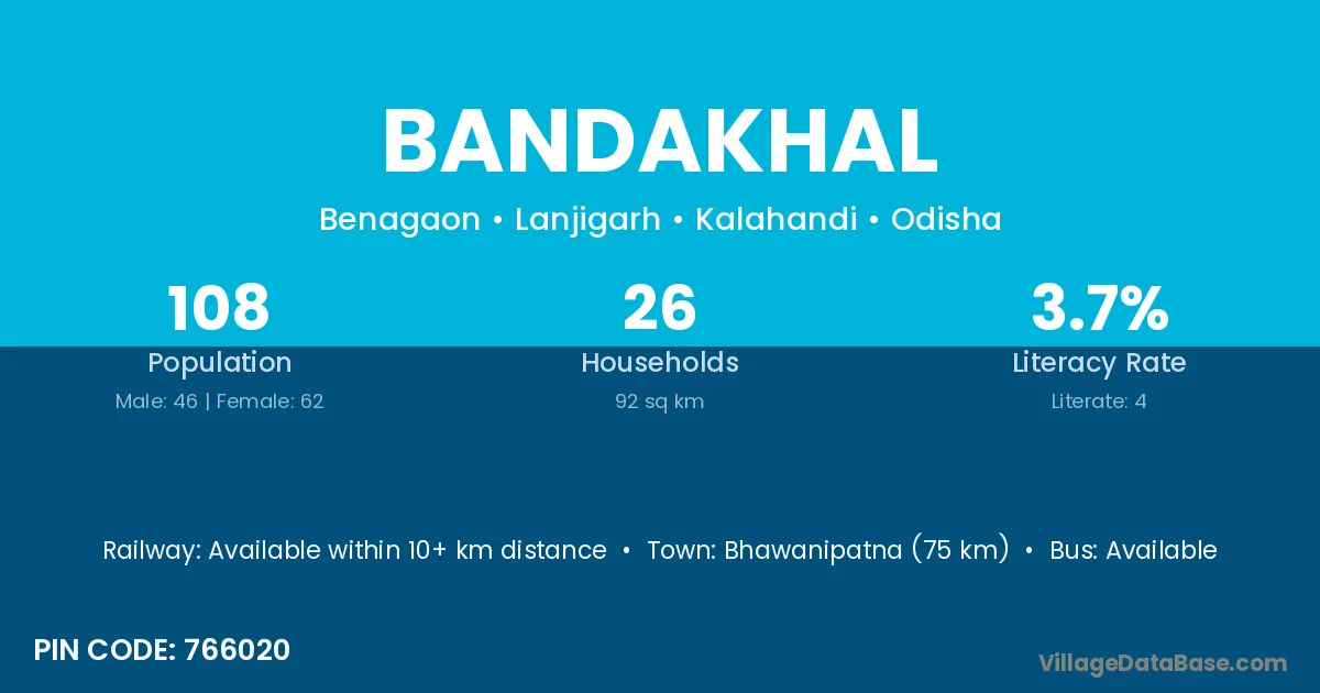 Bandakhal village has a total population of 108 people, of which 46 are males and 62 are females.