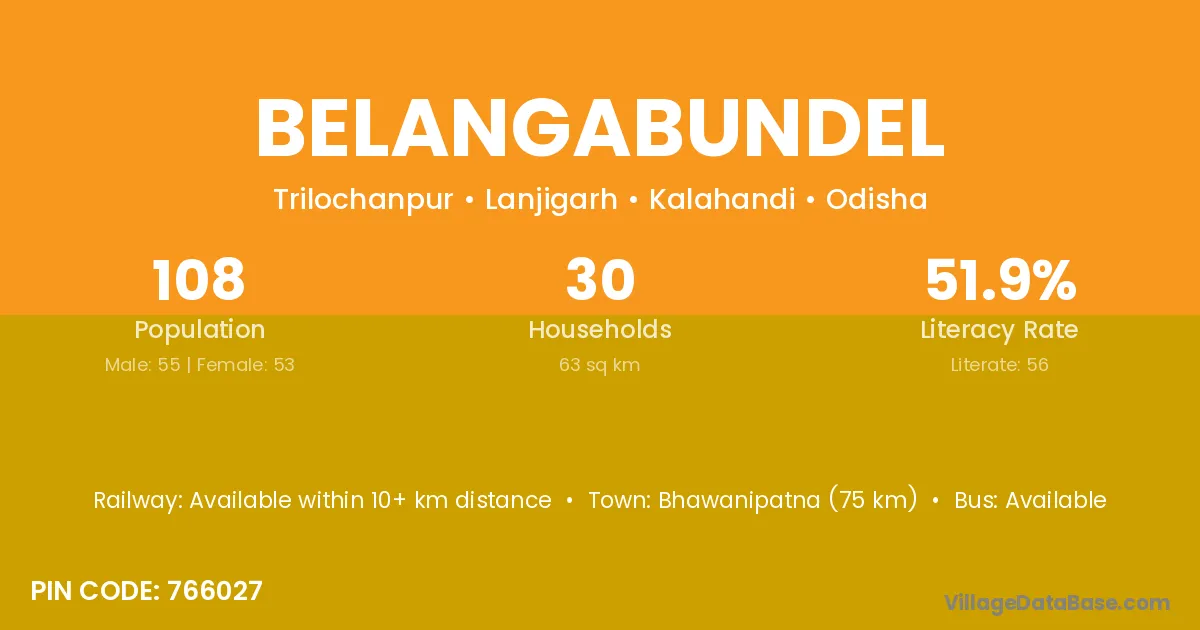Bhawanipatna (75 km) is the nearest town to Belangabundel village for major economic activities and is located approximately 75 km away.