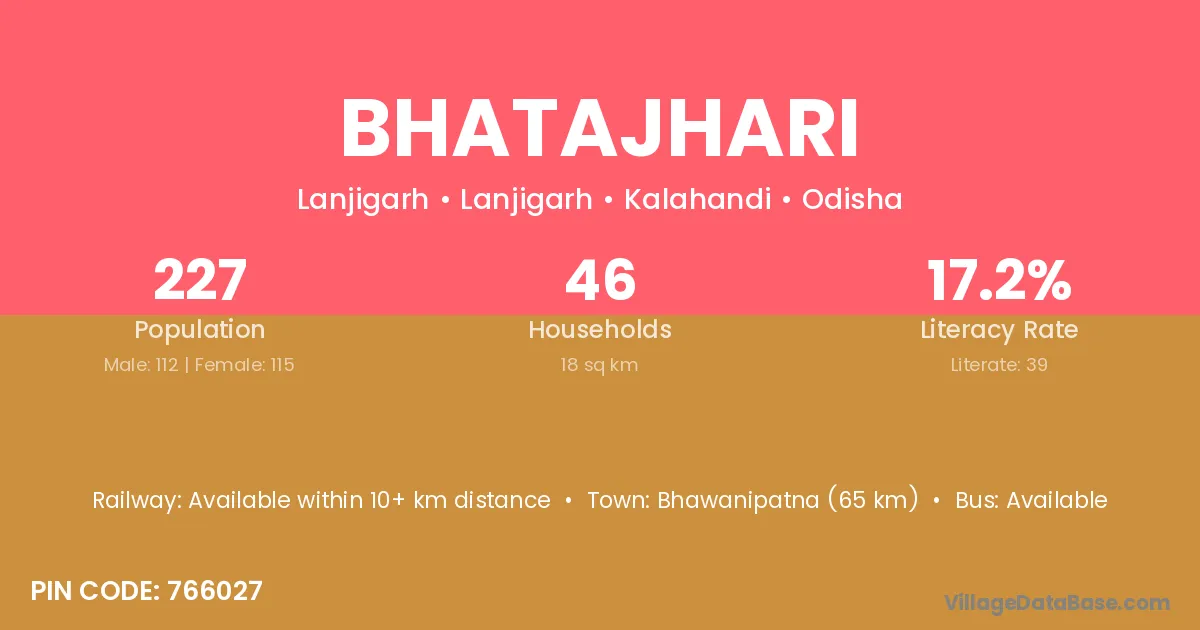 Bhawanipatna (65 km) is the nearest town to Bhatajhari village for major economic activities and is located approximately 65 km away.