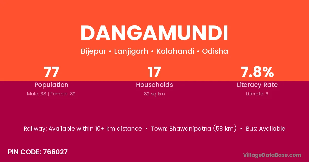 Bhawanipatna (58 km) is the nearest town to Dangamundi village for major economic activities and is located approximately 58 km away.
