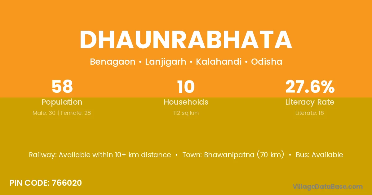 Bhawanipatna (70 km) is the nearest town to Dhaunrabhata village for major economic activities and is located approximately 70 km away.