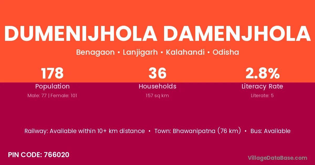 Bhawanipatna (76 km) is the nearest town to Dumenijhola Damenjhola village for major economic activities and is located approximately 76 km away.