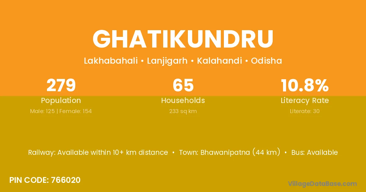 Bhawanipatna (44 km) is the nearest town to Ghatikundru village for major economic activities and is located approximately 44 km away.