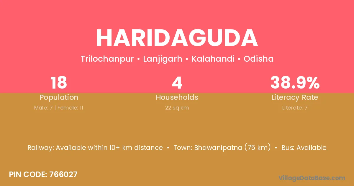 Bhawanipatna (75 km) is the nearest town to Haridaguda village for major economic activities and is located approximately 75 km away.
