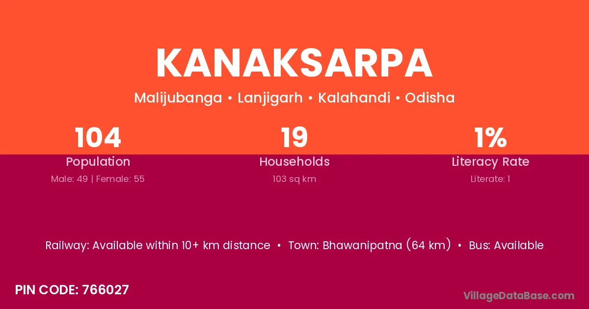 Bhawanipatna (64 km) is the nearest town to Kanaksarpa village for major economic activities and is located approximately 64 km away.