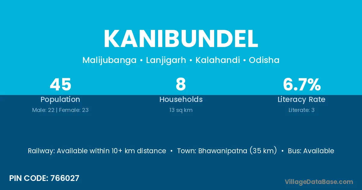 Bhawanipatna (35 km) is the nearest town to Kanibundel village for major economic activities and is located approximately 35 km away.