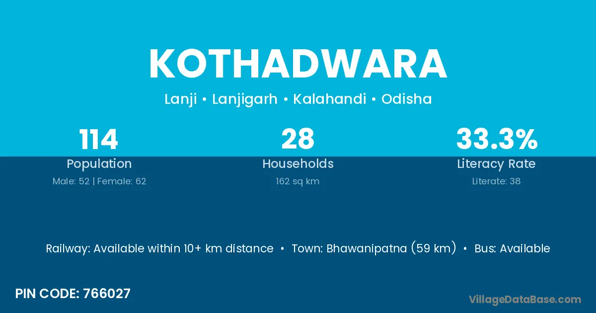 Bhawanipatna (59 km) is the nearest town to Kothadwara village for major economic activities and is located approximately 59 km away.
