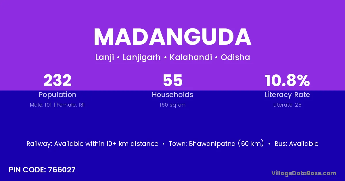 Bhawanipatna (60 km) is the nearest town to Madanguda village for major economic activities and is located approximately 60 km away.