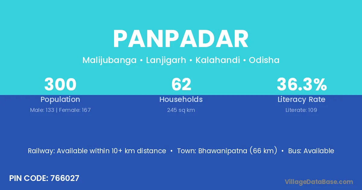 Bhawanipatna (66 km) is the nearest town to Panpadar village for major economic activities and is located approximately 66 km away.
