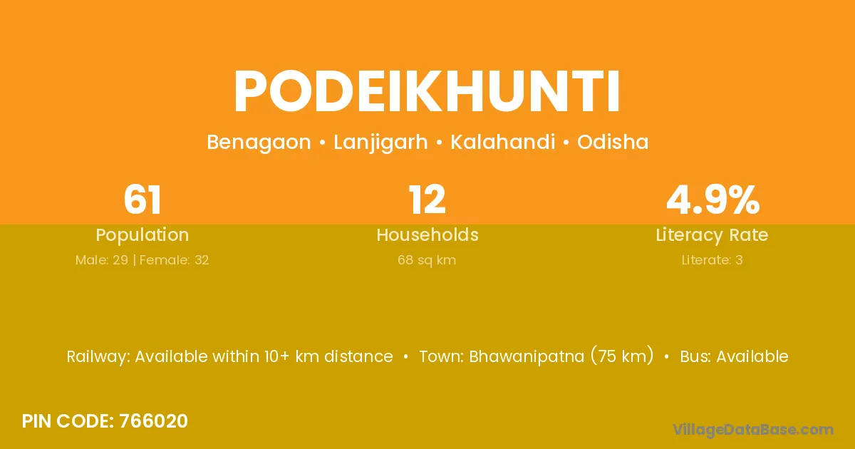 Bhawanipatna (75 km) is the nearest town to Podeikhunti village for major economic activities and is located approximately 75 km away.