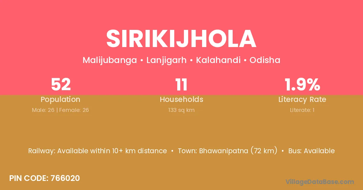 Bhawanipatna (72 km) is the nearest town to Sirikijhola village for major economic activities and is located approximately 72 km away.