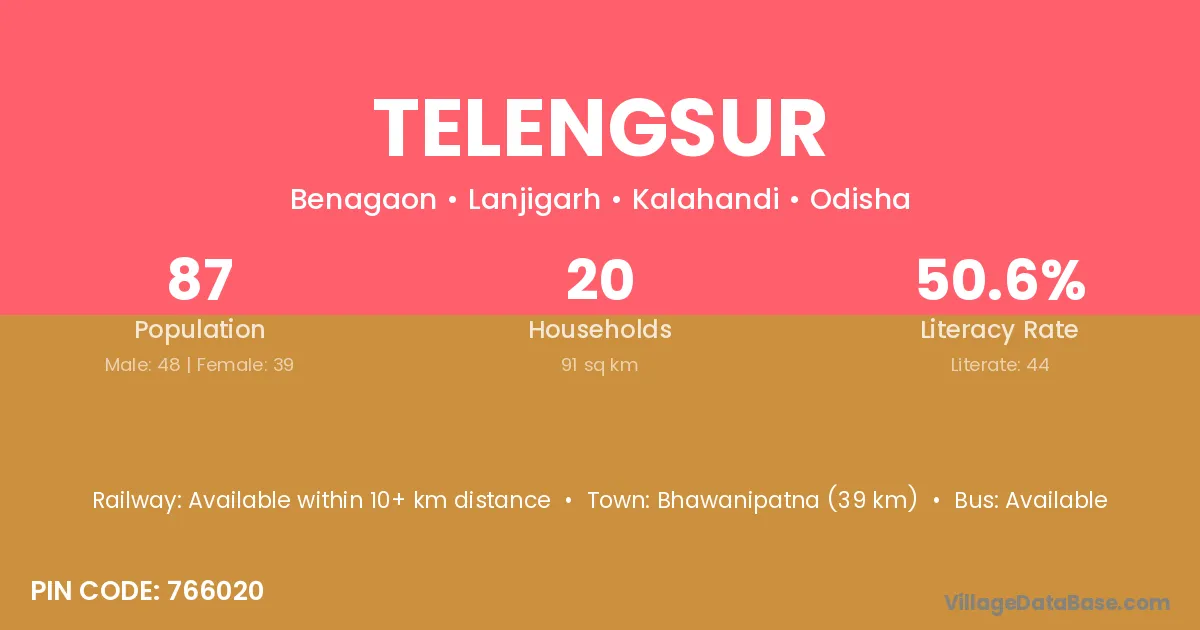 Bhawanipatna (39 km) is the nearest town to Telengsur village for major economic activities and is located approximately 39 km away.
