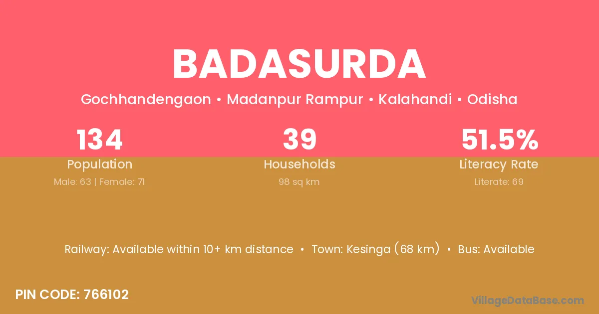 Kesinga (68 km) is the nearest town to Badasurda village for major economic activities and is located approximately 68 km away.