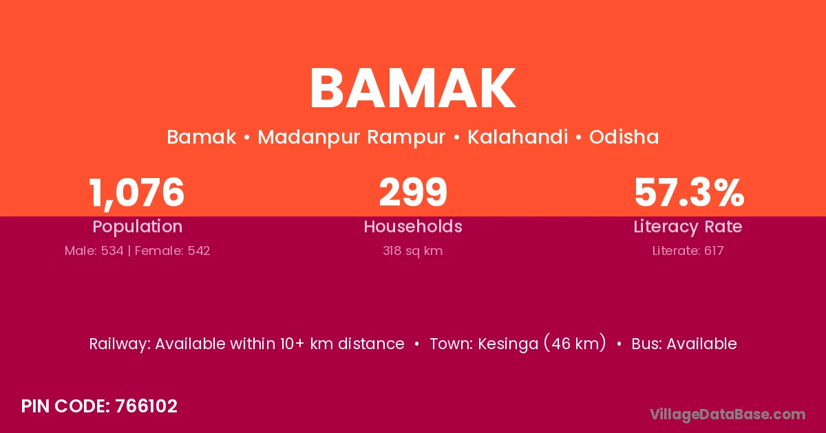 Kesinga (46 km) is the nearest town to Bamak village for major economic activities and is located approximately 46 km away.