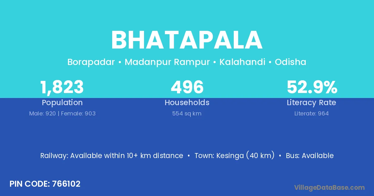Kesinga (40 km) is the nearest town to Bhatapala village for major economic activities and is located approximately 40 km away.