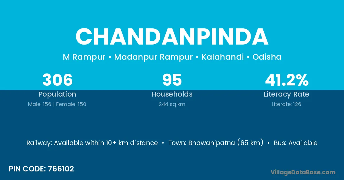 Bhawanipatna (65 km) is the nearest town to Chandanpinda village for major economic activities and is located approximately 65 km away.