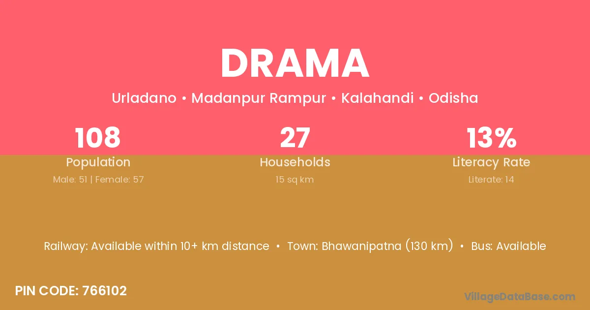 Bhawanipatna (130 km) is the nearest town to Drama village for major economic activities and is located approximately 130 km away.