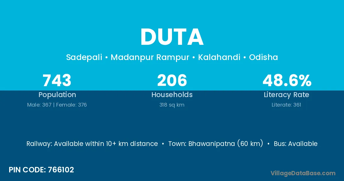 Bhawanipatna (60 km) is the nearest town to Duta village for major economic activities and is located approximately 60 km away.
