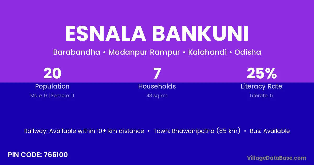 Bhawanipatna (85 km) is the nearest town to Esnala Bankuni village for major economic activities and is located approximately 85 km away.