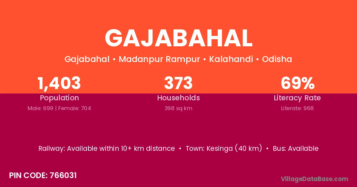 Kesinga (40 km) is the nearest town to Gajabahal village for major economic activities and is located approximately 40 km away.