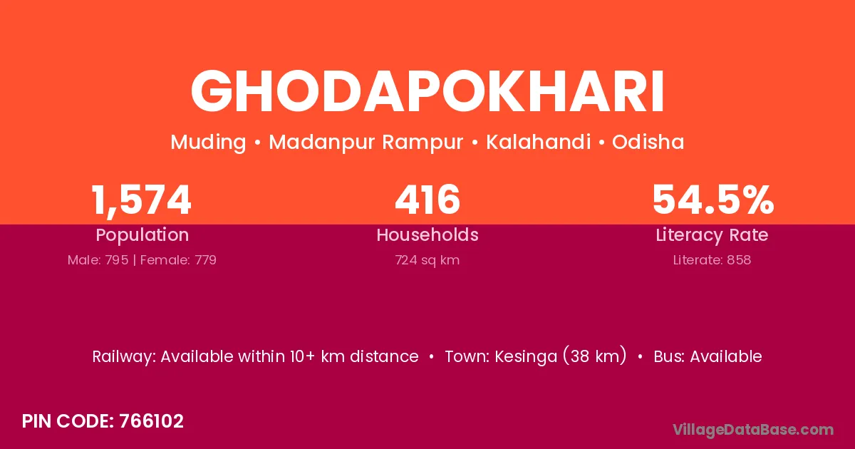 Kesinga (38 km) is the nearest town to Ghodapokhari village for major economic activities and is located approximately 38 km away.