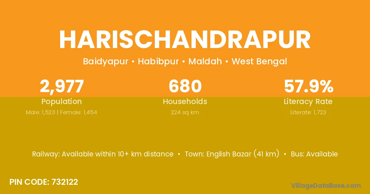 The literacy rate of Harischandrapur village is 41.36%. Male literacy stands at 53.19% and female literacy at 30.52%.