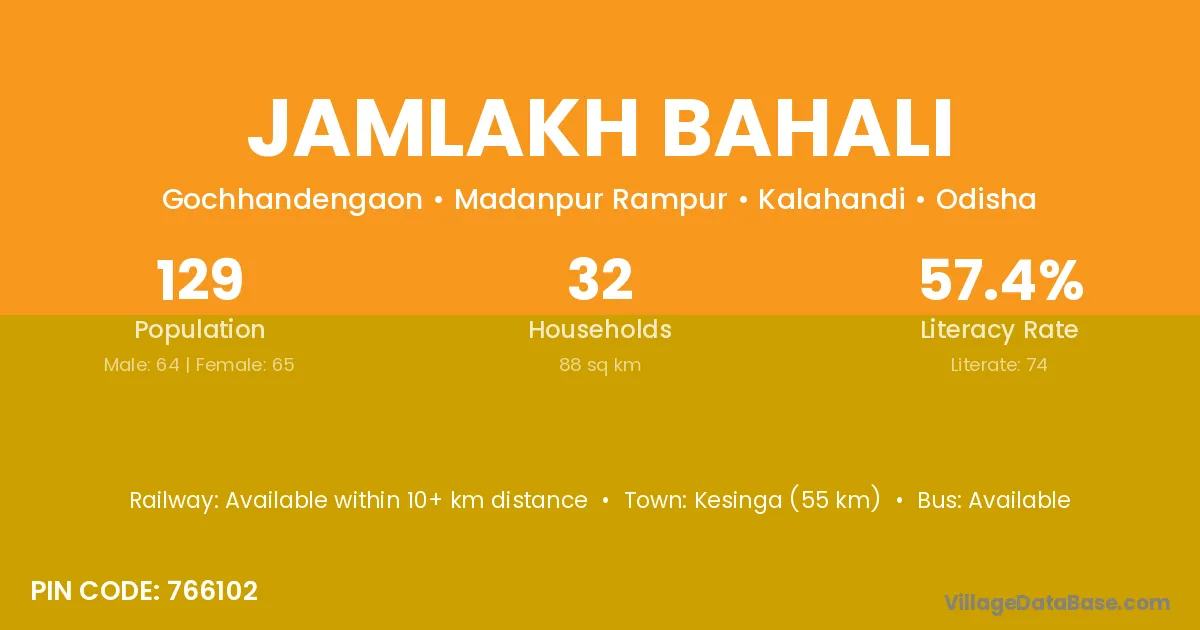 Kesinga (55 km) is the nearest town to Jamlakh Bahali village for major economic activities and is located approximately 55 km away.
