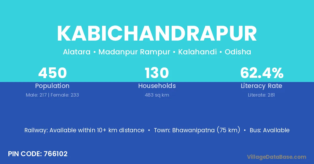 Bhawanipatna (75 km) is the nearest town to Kabichandrapur village for major economic activities and is located approximately 75 km away.