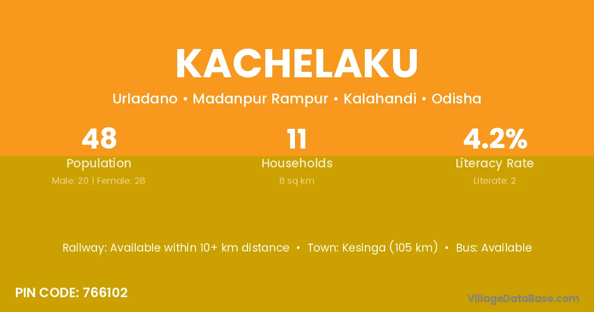 Kesinga (105 km) is the nearest town to Kachelaku village for major economic activities and is located approximately 105 km away.