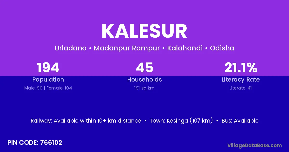 Kesinga (107 km) is the nearest town to Kalesur village for major economic activities and is located approximately 107 km away.