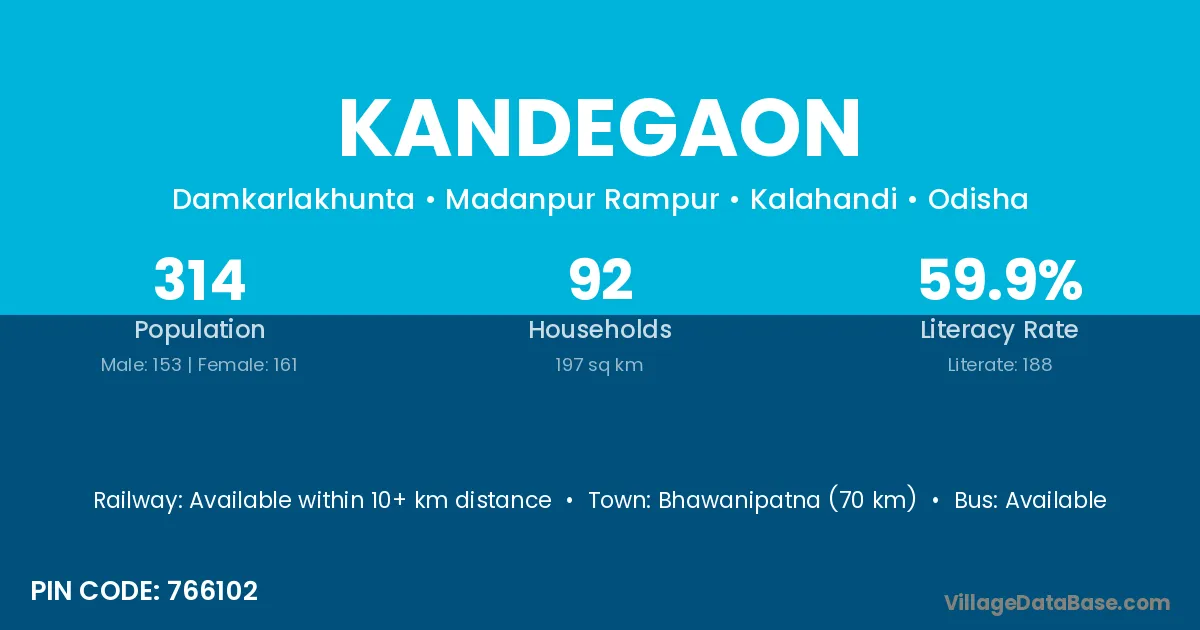 Bhawanipatna (70 km) is the nearest town to Kandegaon village for major economic activities and is located approximately 70 km away.