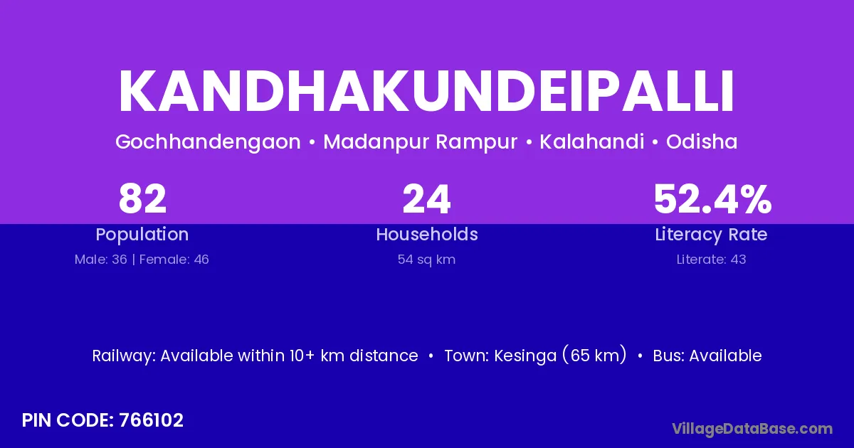 Kesinga (65 km) is the nearest town to Kandhakundeipalli village for major economic activities and is located approximately 65 km away.