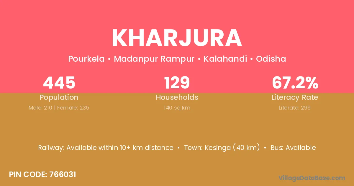 Kesinga (40 km) is the nearest town to Kharjura village for major economic activities and is located approximately 40 km away.