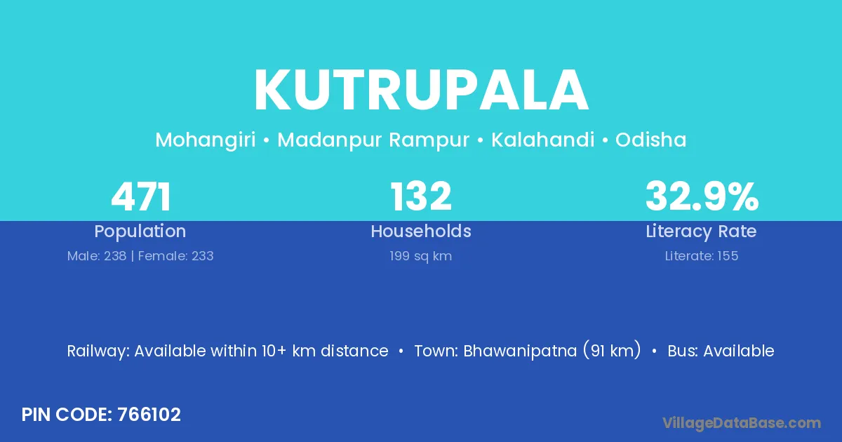 Bhawanipatna (91 km) is the nearest town to Kutrupala village for major economic activities and is located approximately 91 km away.
