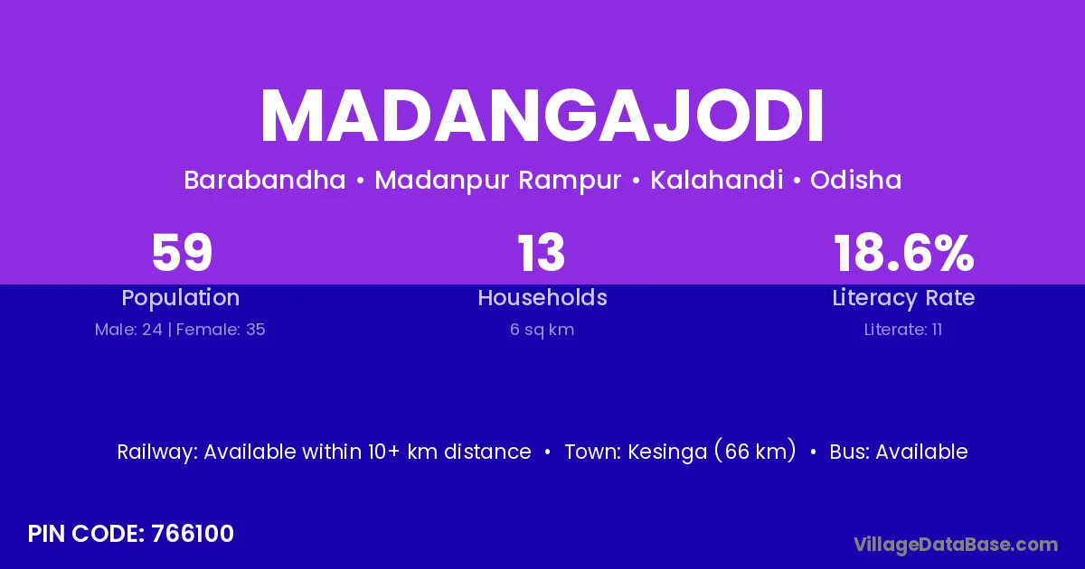 Kesinga (66 km) is the nearest town to Madangajodi village for major economic activities and is located approximately 66 km away.