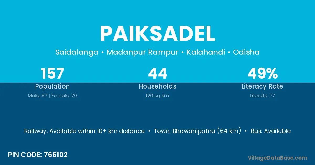 Bhawanipatna (64 km) is the nearest town to Paiksadel village for major economic activities and is located approximately 64 km away.