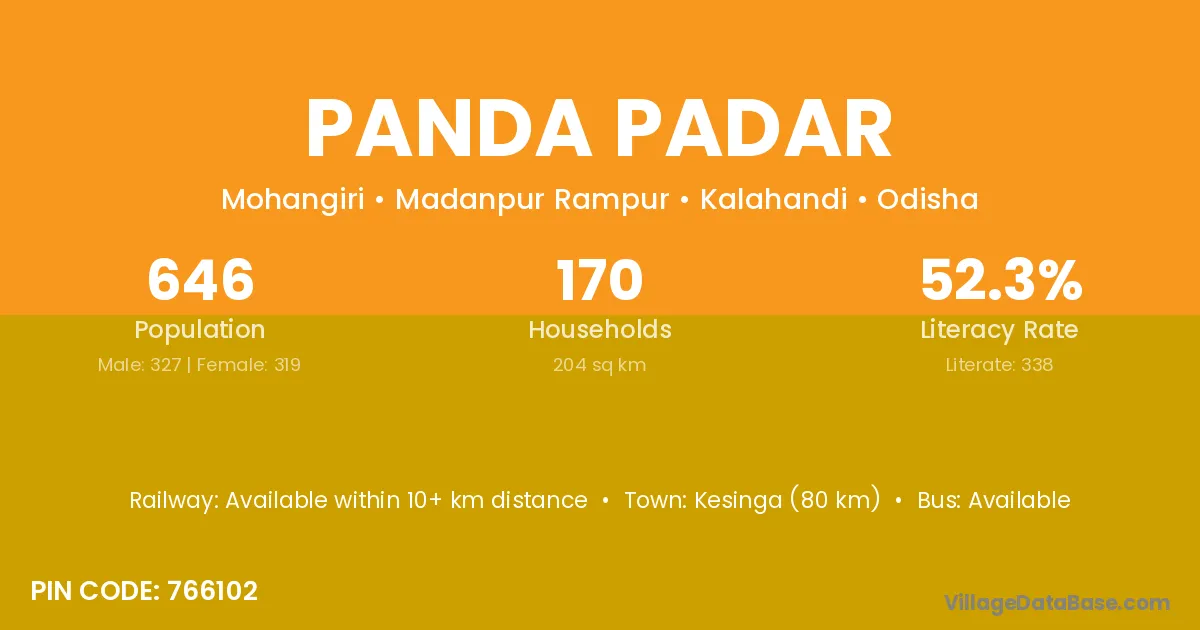 Kesinga (80 km) is the nearest town to Panda Padar village for major economic activities and is located approximately 80 km away.
